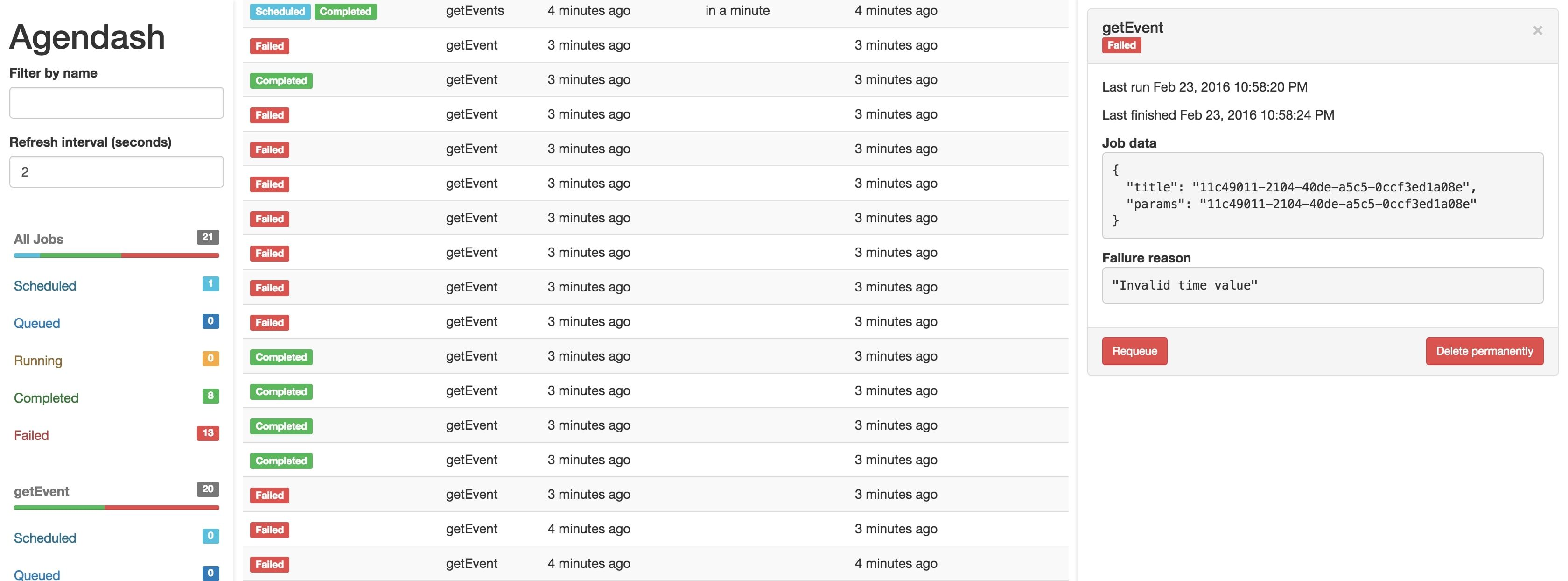 Now your jobs are stored in the DB and are less error prompt but them can occur. A good way to monitor your active, scheduled, and failed jobs are by using Agendash2 the web UI for agendajs Also with have control over the jobs, we can re-schedule, create, run, and delete them.